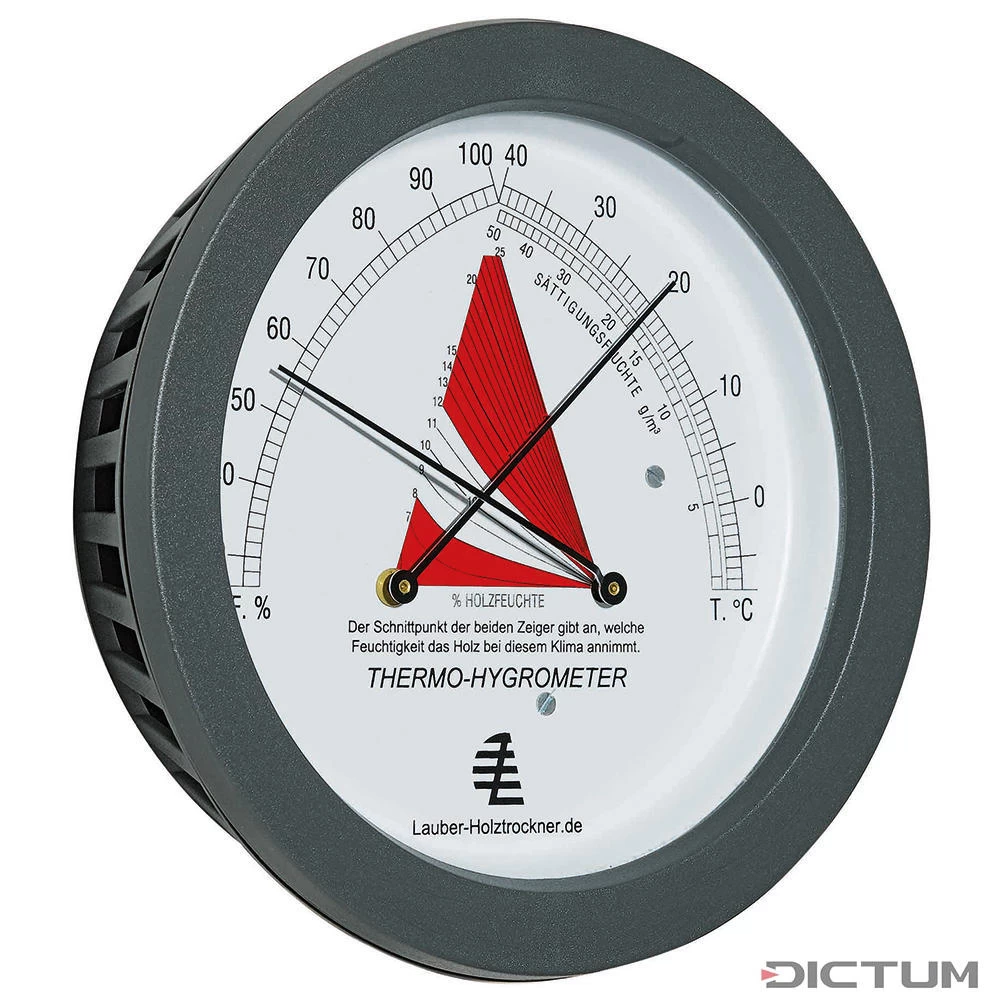 Cet appareil permet de déterminer l’hygrométrie du bois dans une pièce. Les deux aiguilles indiquent respectivement la température et l’humidité relative de l’air. Leur point de recoupement indique le point hygrométrique d’équilibre souhaité. Cette valeur est déterminante pour le retrait et pour le gonflement du bois. L’appareil de mesure permet de contrôler le séchage du bois et la climatisation des ateliers, des entrepôts et des nouveaux bâtiments par rapport à l’hygrométrie du bois. C’est le seul moyen d’obtenir un séchage correct et le degré d’humidité du bois convenable.