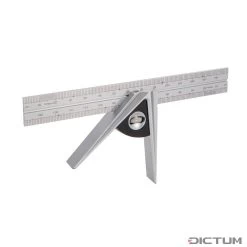 La forme dynamique de la tête est usinée en une seule pièce, pour un transfert des angles extrêmement précis. La règle coulissante sert à la fois de jauge de profondeur et de butée à 45°/90°. La règle peut être facilement retournée ou échangée. La vis moletée est intégrée au centre de la poignée pour une fixation rapide et en toute sécurité. Graduation gravée au laser pour une lecture facile et précise, avec une résolution supplémentaire de 0,5 mm aux extrémités. Tous les composants sont fraisés en acier inoxydable, par commande numérique, et revêtus d’une fine couche par procédé PVD. Les surfaces sont extrêmement résistantes à l’usure et à la corrosion. Grâce au procédé de fabrication spécial, la précision est de 0,05 mm sur 100 mm.