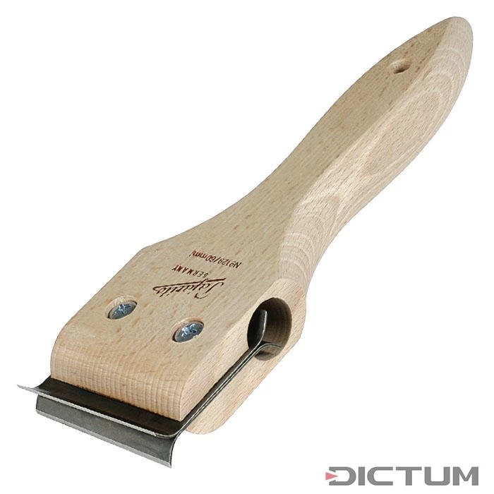 Poignée maniable en hêtre commun avec à la tête deux lames en acier à outils insérées, chacune avec deux tranchants (donc en tout quatre tranchants). Les lames racleuses sont facilement démontables grâce à deux vis cruciformes, pour être retournées, réaffûtées, enlevées ou échangées. Utilisé par les menuisiers et les peintres depuis des générations, apprécié des plaisanciers pour gratter les bateaux, une aide universelle pour le ménage.